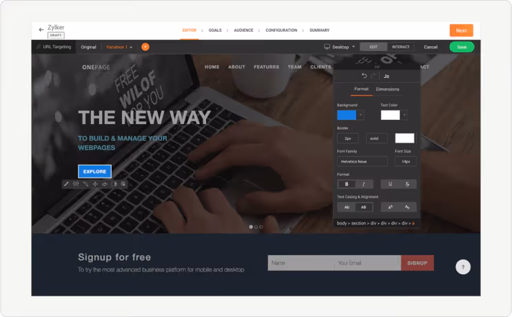 You can create variations for your A/B test in its intuitive visual editor and measure your vital stats, but the software also allows you to: